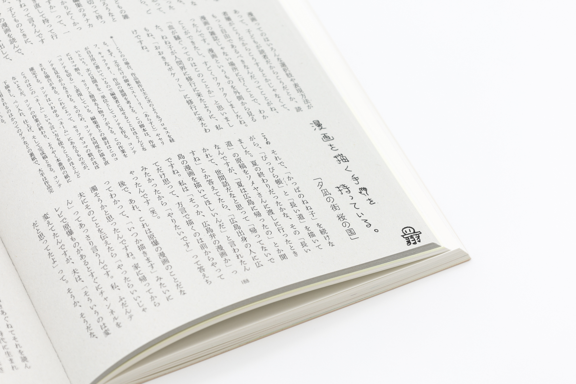 Manga, illustrations, and a wealth of text look back on the long road Fumiyo Kouno has traveled over her thirty years as the author of such acclaimed works as Yunagi no machi, Sakura no kuni (Town of Evening Calm, Country of Cherry Blossoms; Tezuka Osamu Cultural Prize Originality Prize, Japan Media Arts Festival Manga Division Grand Prize) and Kono sekai no katasumi ni (In This Corner of the World; Japan Media Arts Festival Manga Division Excellence Award). The volume opens with more than 140 full-color pages introducing manga manuscripts and illustrations from every phase of her career, including Machikado hanadayori (Stories of Flowers from the Street Corner), Nagai michi (The Long Road), Kokko-san, Kappa no Neneko (Neneko the Kappa), and Borupen Kojiki (Ballpoint-Pen Kojiki). A full-length author interview, a complete annotated list of works, a chronology (the first ever compiled), and a bibliography round out the satisfying reading experience.